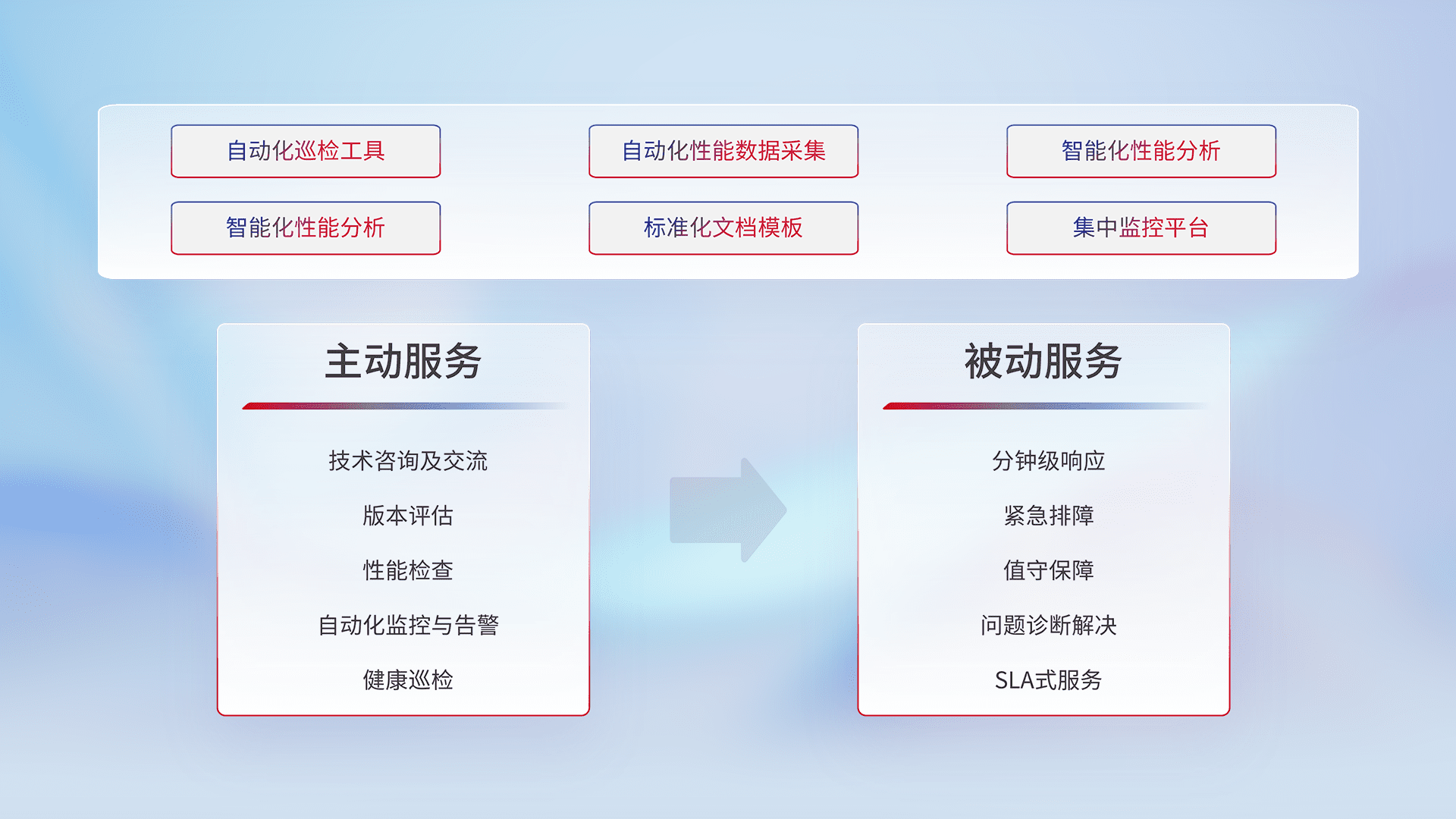 智能化工具和标准化文档,,,,保障服务质量,,,提供主动服务(包含技术咨询、、、、版本评估、、、、性能检查、、、自动化监控与告警、、、健康巡检)和被动服务包含(分钟级响应、、、紧急排障、、值守保障、、问题诊断解决、、、SLA服务)。。